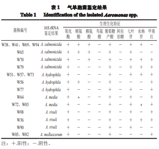 利用分子生物學(xué)方法,對(duì)20 株細(xì)菌進(jìn)行16S rRNA擴(kuò) 增,獲得的序列經(jīng)NCBI數(shù)據(jù)庫(kù)進(jìn)行BLAST比對(duì),結(jié)果 顯示均為氣單胞菌屬(Aeromonas)。生理生化實(shí)驗(yàn)結(jié)果 (表1)顯示,本研究分離的氣單胞菌氧化酶反應(yīng)均為陽 性,均不能利用鳥氨酸和阿拉伯糖,而均具有利用葡萄 糖產(chǎn)酸的能力,但是相同種水平的細(xì)菌在精氨酸、賴氨 酸、七葉苷、水楊苷等的利用上存在差異。Abbott等的 研究也顯示氣單胞菌屬在種水平的鑒定比較困難,傳統(tǒng) 的生理生化反應(yīng)多有重疊,很難明確區(qū)分,而且鑒定的 實(shí)驗(yàn)方法也不一致。結(jié)合16S rRNA結(jié)果,本研究分離的 氣單胞菌屬包括殺鮭氣單胞菌(A. salmonicida,7?株)、 嗜水氣單胞菌(A. hydrophila,5?株)、中間氣單胞菌 (A. media,3?株)、A. rivuli(3?株)和A. molluscorum (2?株),其中嗜水氣單胞菌包含多個(gè)亞種。