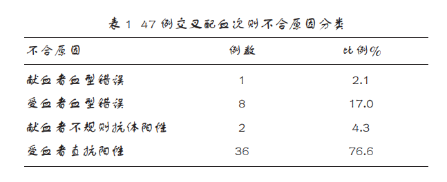 次側(cè)交叉配血不合 47 例中,受血者直抗陽性 36 例,占總數(shù)的 76.6%,患者血型鑒定錯(cuò)誤 8 例, 獻(xiàn)血者血型錯(cuò)誤 1 例, 獻(xiàn)血者不規(guī)則抗體陽性 2 例,分別占 17.0%,2.1%和 4.3%。 47 例交叉配血次 則不合原因分析見表 1。