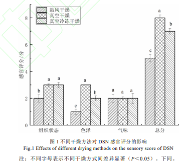 不同干燥方法對 DSN 感官評分的影響見圖 1。由圖 1 可知,真空干燥與真空冷凍干燥對 DSN 組 織狀態(tài)評分影響無顯著性差異(P>0.05),但兩者顯著大于鼓風(fēng)干燥(P<0.05),這可能是由于鼓風(fēng)干燥溫度較高,制得的 DSN 質(zhì)地較硬,蟲體表面開裂。3 種干燥方法顯著影響 DSN 的色澤(P< 0.05),真空干燥制得的干制品色澤評分最高,這是由于真空干燥溫度適中,美拉德反應(yīng)產(chǎn)生亮黃 色,有光澤;而鼓風(fēng)干燥的高溫,使美拉德反應(yīng)劇烈,肉體顏色偏重。3 種干燥方法對 DSN 的氣味 影響不顯著(P>0.05)。總分顯示 3 種干燥方法間差異顯著(P<0.05),真空干燥的評分最高,鼓 風(fēng)干燥最低。3 種干燥方法顯著影響 DSN 的復(fù)水率(P<0.05),真空冷凍干燥的復(fù)水速度與復(fù) 水率最大,真空干燥次之,鼓風(fēng)干燥最小。干燥過程中樣品細(xì)胞結(jié)構(gòu)的破壞程度決定了干制品的復(fù)水 性能。真空冷凍干燥制得的 DSN 表面與肌肉纖維間存在大量的孔隙,水分滲入速度快且復(fù)水率 高;金洋等的研究發(fā)現(xiàn)真空冷凍干燥制得烏賊的復(fù)水速度與復(fù)水率均大于自然晾曬干燥與熱風(fēng)干 燥,支持了本研究結(jié)果。真空干燥與鼓風(fēng)干燥由于干燥溫度相對較高,干燥過程中方格星蟲組織內(nèi)的 細(xì)胞結(jié)構(gòu)被破壞或錯位,且不可逆轉(zhuǎn),進而肌肉組織收縮,結(jié)構(gòu)塌陷,DSN 的復(fù)水率減??;鼓 風(fēng)干燥溫度最高,制得的 DSN 內(nèi)部的肌肉纖維排列致密,復(fù)水的水分難以滲入,復(fù)水率最低。