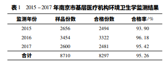 2015 - 2017 年對(duì)南京市基層醫(yī)療機(jī) 構(gòu)各重點(diǎn)科室進(jìn)行常規(guī)采樣監(jiān)測,二級(jí)醫(yī)療機(jī)構(gòu)每年監(jiān)測兩次,一級(jí)和無級(jí)別醫(yī)療機(jī)構(gòu)每年監(jiān)測一次。監(jiān) 測地點(diǎn)包括手術(shù)室、ICU、新生兒室等重點(diǎn)科室。監(jiān) 測項(xiàng)目為室內(nèi)空氣、醫(yī)務(wù)人員手、物體表面、使用中 消毒液、壓力蒸汽滅菌器(上海博迅醫(yī)療生物儀器股份有限公司提供)滅菌效果、紫外線燈、醫(yī)療器材、污 水。3 年共計(jì)采集樣品 8 710 份。
