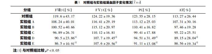2. 1 對照組與實驗組凝血因子變化情況( 見表 1)