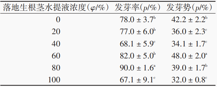 表1 落地生根莖水提液對(duì)穿心蓮種子萌發(fā)的影響